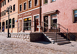 Geländer an einem großzügig gestalteten Eingangsbereich Flachstahl, feuerverzinkt.