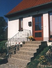 Treppe im Eingangsbereich mit Stahlziergeländer,