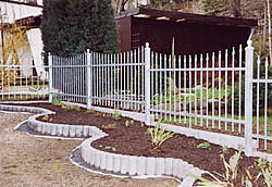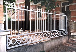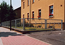Zaunanlage für Vorgarten eines Mehrfamilienhauses. Zaunfelder in Hohlprofilrahmen. Füllung mit gedrehten Stäben und Ornamenten. |